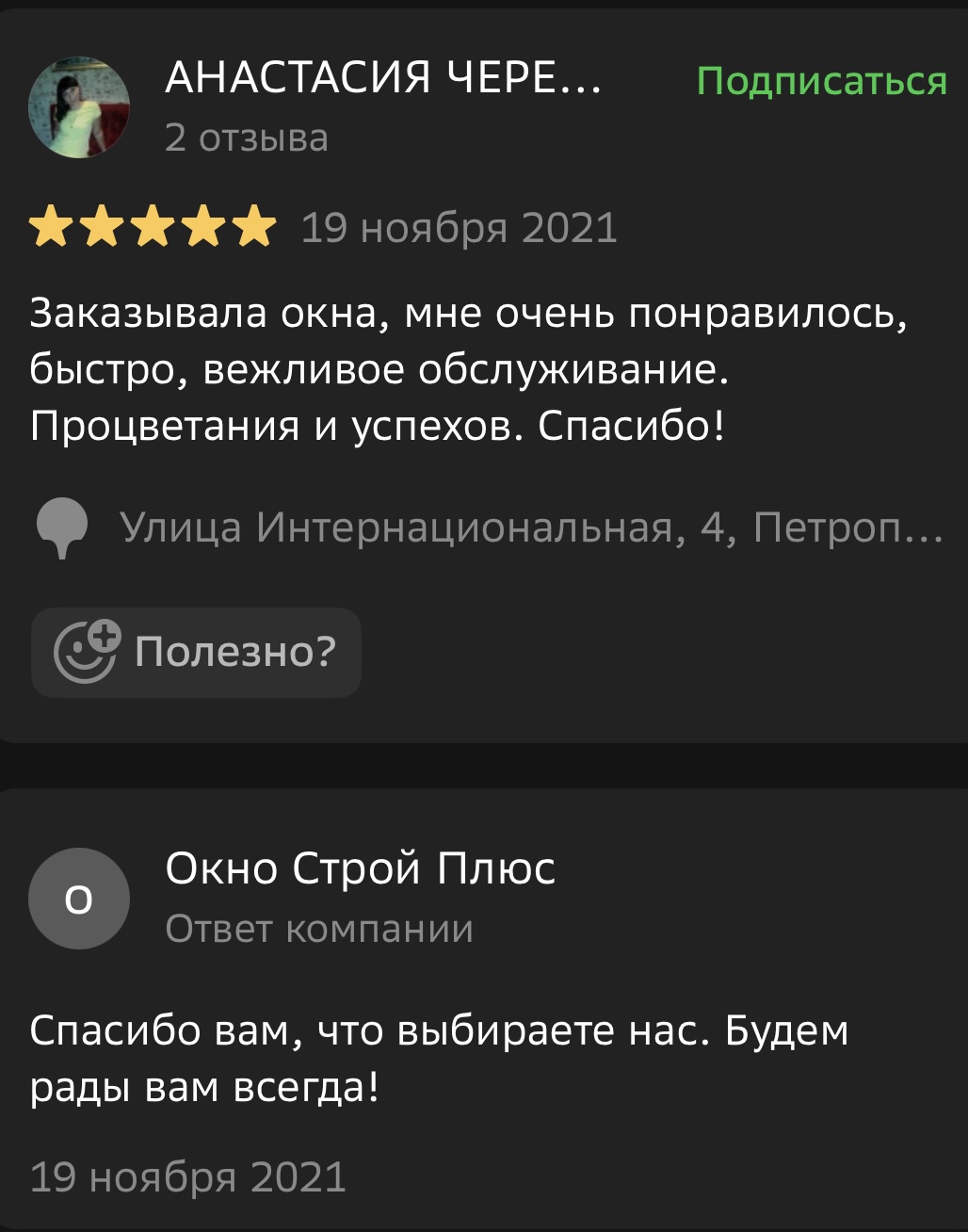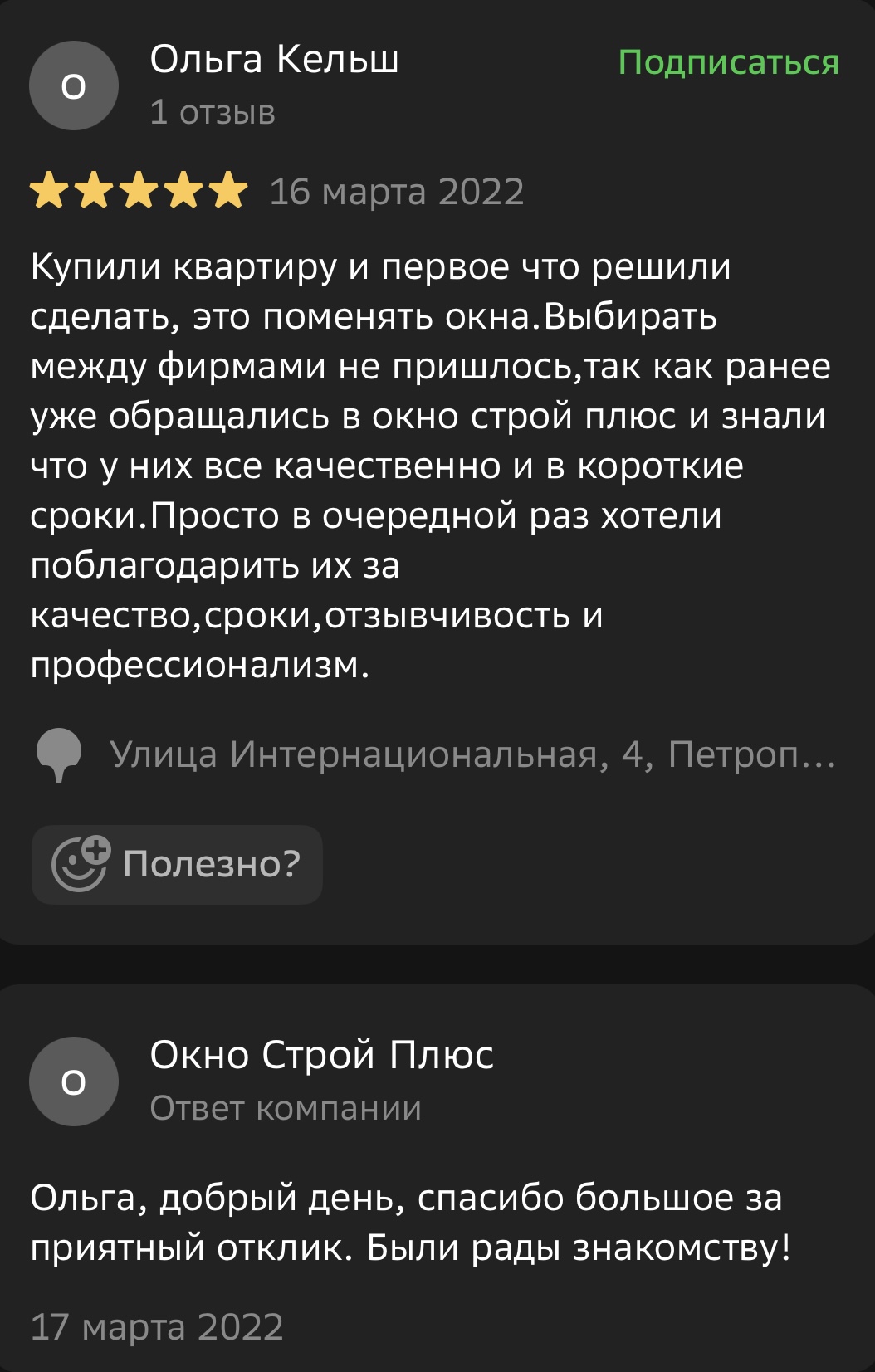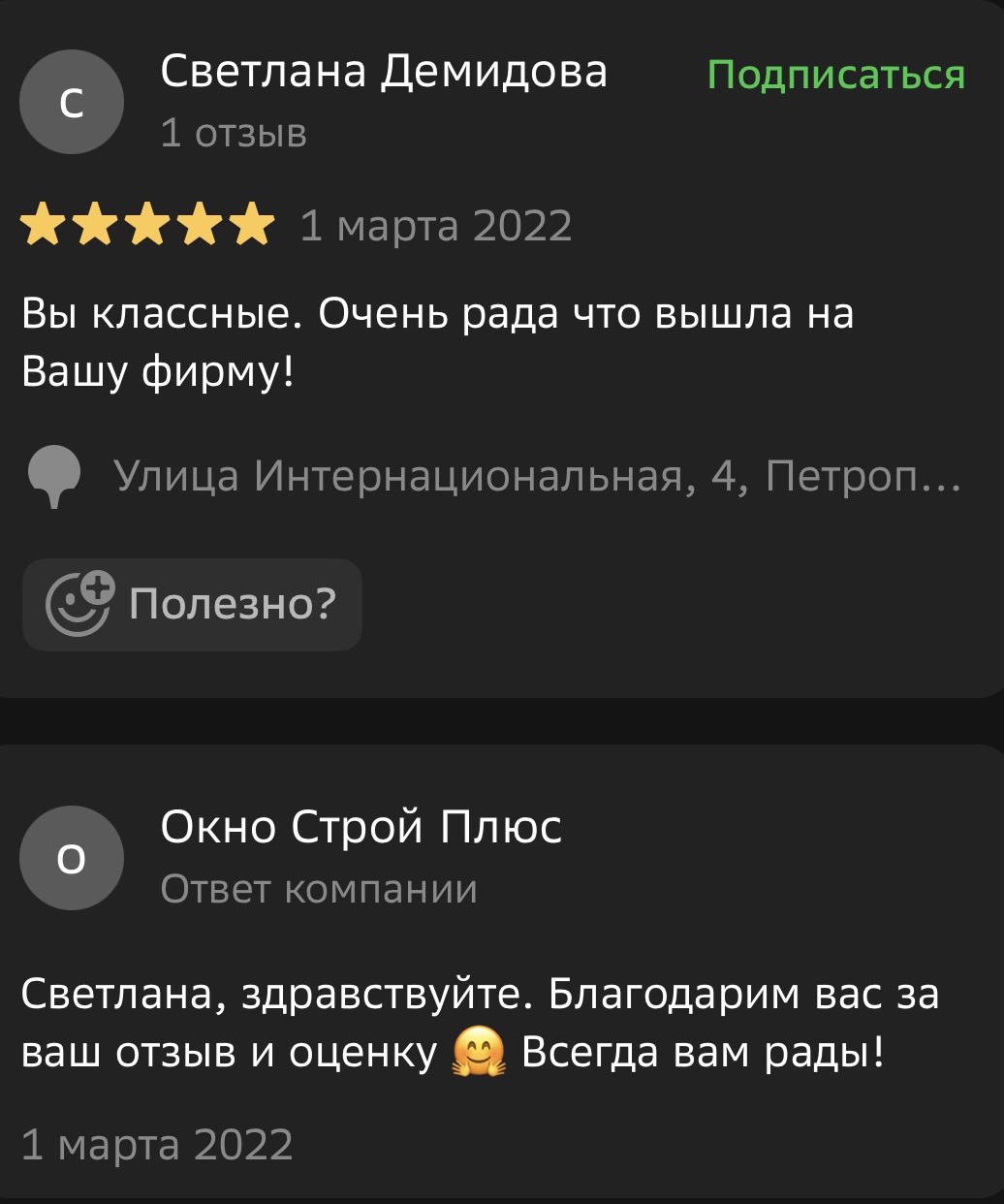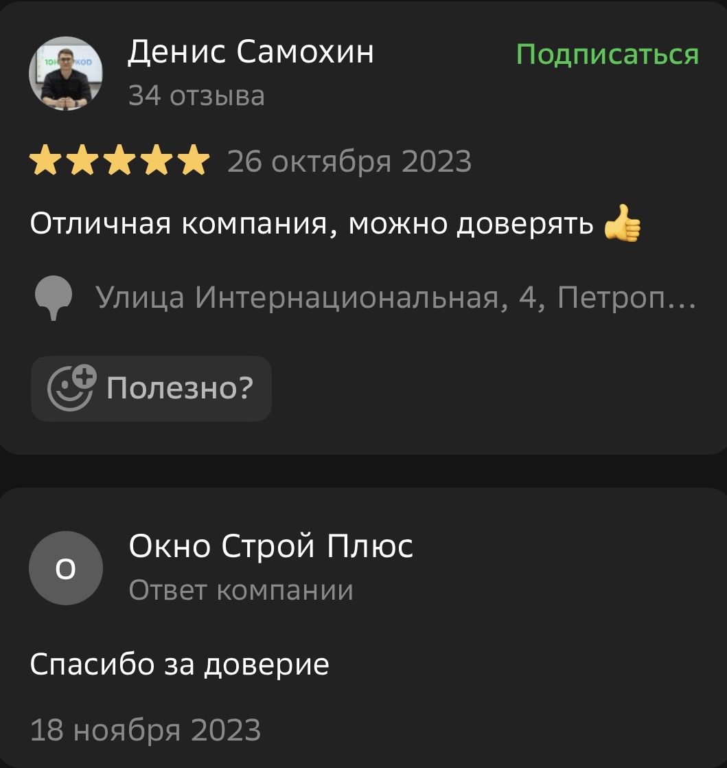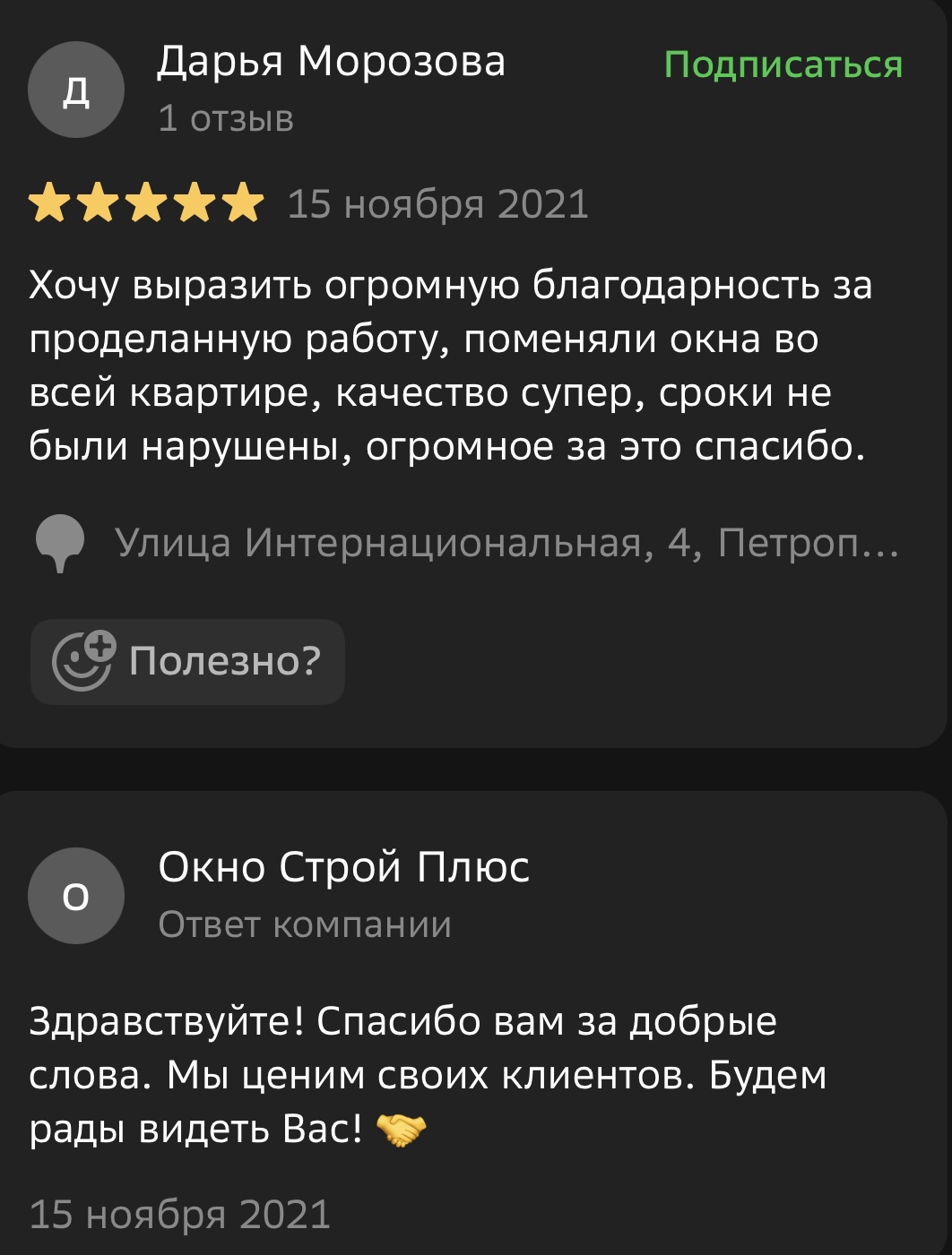 Мы ценим обратную связь и внимательно относимся к каждому отзыву. Поделитесь своим впечатлением о работе с компанией «Окно Строй Плюс» — оставьте отзыв на сайте или направьте его нам в WhatsApp.